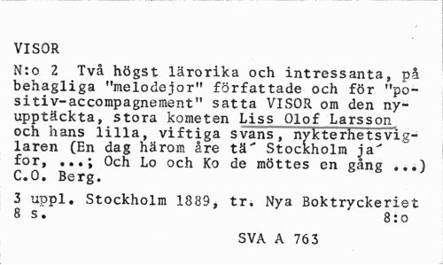 //// VISOR //// N:o 2 Två högst lärorika och intressanta, på behagliga "meloclejor" författade och för "po-sitiv-accompagnement" satta VISOR om den nyupptäckta, stora kometen Liss Olof Larsson^ och hans lilla, viftiga svans, nykterhetsvig-laren (En dag härom åre tä" Stockholm ja" for, Och Lo och Ko de möttes en gång ...) //// C.O. Berg. //// 3 uppl. Stockholm 1889, tr. Nya Boktryckeriet 8 s. 8: o //// SVA A 76 3 ////