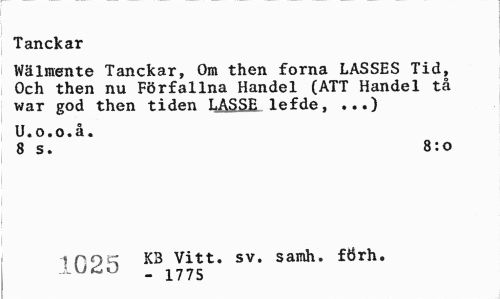 //// Tanckar //// Wälmente Tanckar, Om then forna LASSES Tid, Och then nu Förfallna Handel (ATT Handel tå war god then tiden LASSE lefde, ...) //// U.o.o.å. //// 8 s. 8:0 //// 1Q25 K3 Vitt. sv. samh. ftfrh. ////