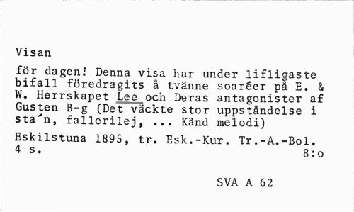 //// Visan //// för dageni Denna visa har under lifligaste bifall föredragits å tvänne soaréer på E. & W. Herrskapet Lee och Deras antagonister af Gusten B-g (Det väckte stor uppståndelse i sta'n, fallerilej, ... Känd melodi) //// Eskilstuna 1895, tr. Esk.-Kur. Tr.-A.-Bol. 4 s. 8:0 //// SVA A 62 ////