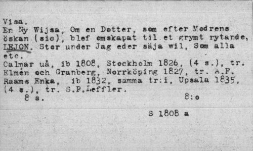 //// Vi sa. //// En Ny Wijaa, Om en Dotter, sons efter Mod rene cskan (sie), blef omskapat til et grymt rytande» T.TfrTfifrT Stor under Jag eder säja wll, Som alla etc. //// Calrnar uå, ib 1808, Stockholm 1826, (4 s.), tr. Elmén ech Granberg, Norrköping 1827, tr. A.P. Raams Enka, ib 1832, samma tr:i# Upsala 1835, (4 a.), tr. S.P.Leffler. //// 8 s. 8:0 //// S 1808 a ////