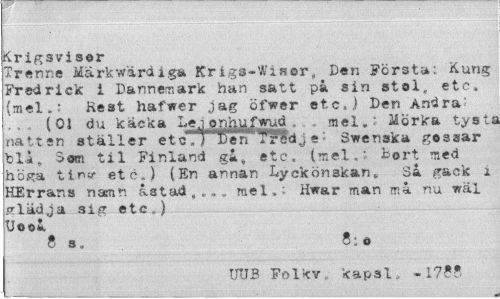 //// Krigsvi sor //// Trenne Märkwärdiga Krigs-Wisor, Den Första: Kung Fredrick i Dannemark han satt på sin stol, etc, (mel.: Kest hafwer jag öfwer etc,) Den Andra' //// (01 du käcka Lejj^u/wud mel.: Mörka tysts natten ställer etc. i Den Tredje* Swenska gossar bli, »om til Finland ga, etc, (mel.; Bort med höga t in* etc.) (En annan Lyckönskan. Sa gäck x HErrar.s namn åstad,.,, mel.; Hw&r man ma nu wäl fflädja etc.) //// Uooa //// 8 s. 8 • o //// UUB Folkv, kapsi, -1788 ////