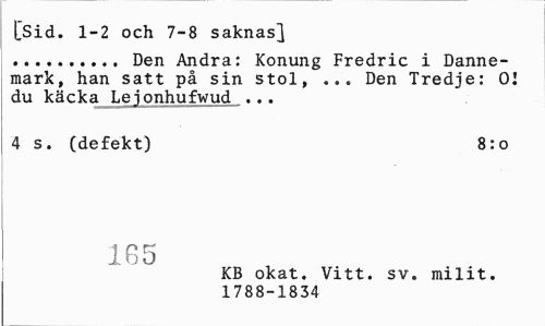 //// [Sid. 1-2 och 7-8 saknas} //// ... Den Andra: Konung Fredric i Dannemark, han satt på sin stol, ... Den Tredje: 01 du käcka Lejonhufwud ... //// 4 s. (defekt) 8:o //// 165 //// KB okat. Vitt. sv. milit. //// 1788-1834 ////