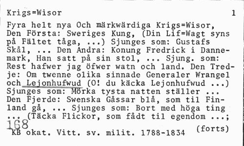 //// Krigs=Wisor 1 //// Fyra helt nya Och märkwärdiga Krigs=Wisor, Den Första: Sweriges Kung, (Din Lif=Wagt syns på Fältet tåga, ...) Sjunges som: Gustafs Skål, ... Den Andra: Konung Fredrick i Danne-mark, Han satt på sin stol, ... Sjung, som: Rest hafwer jag öfwer watn och land. Den Tredje: Om twenne olika sinnade Generaler Wrangel och^Lejonhufwud (0! du käcka Lejonhufwud ...) Sjunges"som: Mörka tysta natten ställer ... Den Fjerde: Swenska Gåssar blå, som til Finland gå, ... Sjunges som: Bort med höga ting ... (Täcka Flickor, som fådt til egendom ...; //// IB okat. Vitt. sv. milit. 1788-1834 ££orts) ////