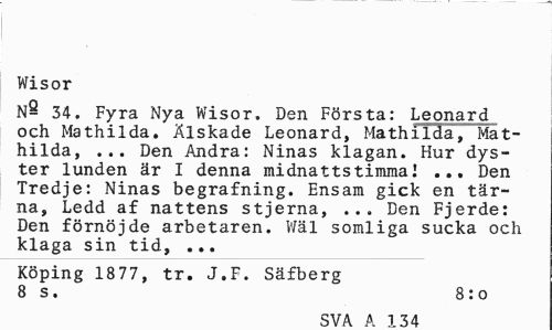 //// Wisor //// N- 34. Fyra Nya Wisor. Den Första: Leonard och Mathilda. Älskade Leonard, Mathilda, Mat-hilda, ... Den Andra: Ninas klagan. Hur dyster lunden är I denna midnattstimma I ... Den Tredje: Ninas begrafning. Ensam gick en tärna, Ledd af nattens stjerna, ... Den Fjerde: Den förnöjde arbetaren. Wä1 somliga sucka och klaga sin tid, ... //// Köping 1877, tr. J.F. Säfberg 8 s. 8:o //// SVA A 1 ////