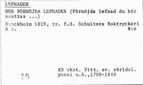 //// LEFNADEN //// DEN FÖRNÖJDA LEFNADEN (Förnöjda lefnad du bör SKattas ...) //// Stockholm 1819, tr. £.d. Schultses Boktryckeri 4 s . 8:0 //// KB okat. Vitt. sv. världsl. //// poesi u.å. ,1700-1849 ////