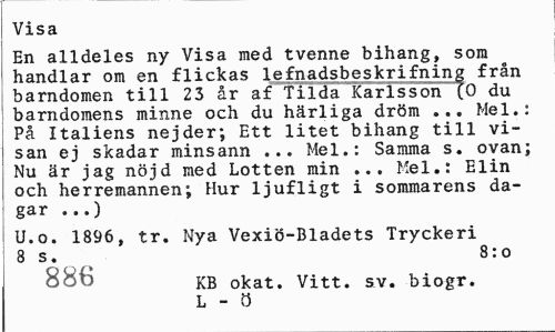 //// Visa //// En alldeles ny Visa med tvenne bihang, som handlar om en flickas lefnadsbeskrifning från barndomen till 23 år af Tilda Karlsson (O du barndomens minne och du härliga dröm ... Mel.: På Italiens nejder; Ett litet bihang till visan ej skadar minsann ... Mel.: Samma s. ovan; Nu är jag nöjd med Lotten min ... Mel.: Elin och herremannen; Hur ljufligt i sommarens dagar ...) //// U.o. 1896, tr. Nya Vexiö-Bladets Tryckeri 8 s. 8:o //// KB okat. Vitt. sv. biogr. //// L - 8 ////