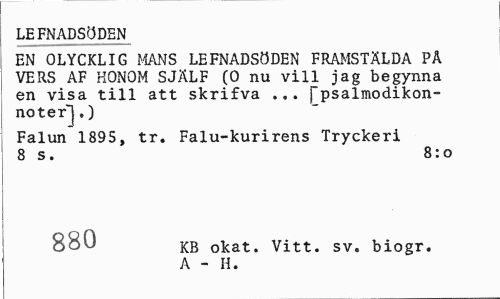 //// LEFNADSÖDEN //// EN OLYCKLIG MANS LEFNADSÖDEN FRAMSTÄLDA PÄ VERS AF HONOM SJÄLF (O nu vill jag begynna en visa till att skrifva ... fpsalmodikon-noter~j.) //// Falun 1895, tr. Falu-kurirens Tryckeri 8 s. 8:0 //// 880 KB okat. Vitt. sv. biogr. //// A - H. ////
