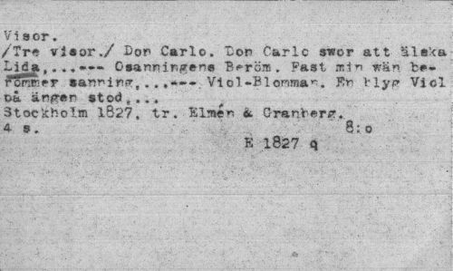 //// Vi a or. //// /Tre via or./ Don Carlo. "Don Carlc s-wor att älska. Lid»., ..».»«» Oaanningen® B<*rcm. Fast min mrän ror^rfr sanning, .,,«*•»» Vi ol-Bl ömma"-. En blyg Viol t>å ängar stod , ... //// Stockholm 1827, tr. Elmén & Granberg. As. 8:0 //// E 1827 q ////