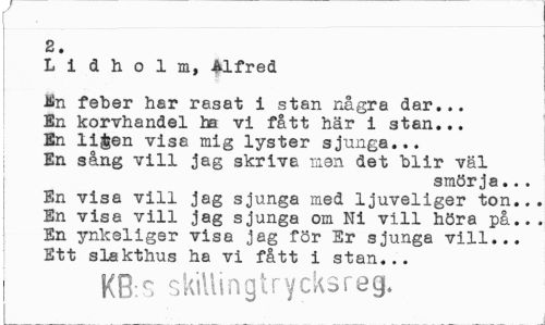 //// 2. //// L i d h o 1 m, Alfred //// Jfin feber har rasat i stan några dar... En korvhandel ha vi fått här i stan... En ligen visa mig lyster sjunga... En sång vill jag skriva men det blir väl //// smörja... //// En visa vill jag sjunga med ljuveliger ton.., En visa vill jag sjunga om Ni vill höra på.. En ynkeliger visa jag för Er sjunga vill... Ett slakthus ha vi fått i stan... //// I KB s s killin g t rycks re g. //// i ////