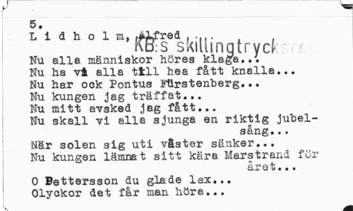 //// y //// 5. //// L i d h o 1 m, ,*JLfred ... //// fäts skillingtryd //// Nu alla människor höres klaga... Nu ha vå alla till hea fått knalla... Nu har ock Pontus itirstenberg... Nu kungen jag träffat... Nu mitt avsked jag fått... Nu skall vi alla sjunga en riktig jubelsång. .. //// När solen sig uti väster sänker... Nu kungen lämnat sitt kära Marstrand för //// året... //// 0 Bettersson du glade lax... Olyckor det får man höra... ////