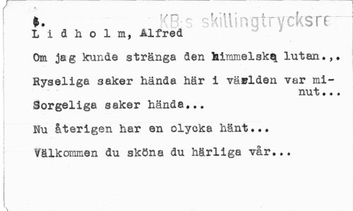 //// f //// ~ skillinutrvcksrr //// L i d h o 1 m, Alfred //// Om jag kunde stränga den Mramelskq. lutan.,, //// Ryseliga saker hända här i väslden var minut .. . //// Sorgeliga saker hände,.. Nu återigen har en olycka hänt... Välkommen du sköna du härliga vår... //// I ////