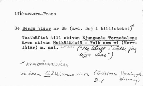 //// LiV.kavaara-Frans //// Se Bergs Visor nr 88 (avd. D;3 i "biblioteket) //// Texthäftet till skivan Sjungande Tornedalen; även skivan Meikäläisiä - Folk som vi (Horr- //// låtar) m. mel. éx>3 f»^ /sötfzi //// * •> //// fatm br&MHGrl/tZQh //// Se. Q. U. v V»kJ rx ^yjÅ //// p-/ ir^e^-y) ////