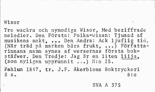 //// Wisor //// Tre wackra och nymod.iga Wisor, Med beziffrade melodier. Den. Första: Polka=visan: Tjusad af musikens makt, ... Den Andra: Ack ljuflig tid. (När träd på marken bära frukt, ...) Författarinnans namn synes af versernas första bok-stäfwer. Den Tredje: Jag är en liten lilja, (som nyligen upprunnit ,».) N:o 25. //// Fahlun 1847, tr, J.F. Åkerbloms Boktryckeri 8 s. 8:o //// SVA A 375 ////