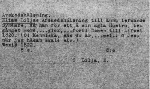 //// ma •' ¦ - - 4 i % - //// '. 'V'.--:: ' ¦ i "¦ ' ' Avsked »hälsning. //// Elias Liljas Af sked shä.1* ning till ännu lefwande //// syndare ,**"?&" han f<5r #tt å sin ägta Hustru, fce-. \ //// gånget m.«rd .fÖrhi- Demen ti^ Lifwtt //// 1820. (01 Menniskat eho du är,...mel.; O Jesu //// när jag hädan ska 1-1 etc.) Wexiö 1822. //// 8 a fi-o //// o s . _ — g. O . ... //// -11 mm0 i # j g» //// ;: • W ////