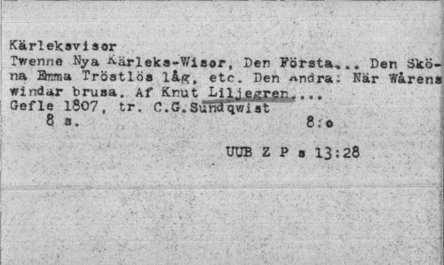 //// Kärl ek;av i a or //// Twenrie Nya Kärleka-Wiaor, Den Förat»,,. Den Sköna ihrma Tröatlöa låg, etc. Den Andra; När Warens windar bruaa. Af Knut LilJ eggan... Gefle 1807, tr. C.G.Sunfqwiat //// 8 3. 8;o //// UUB Z P a 13:28 ////