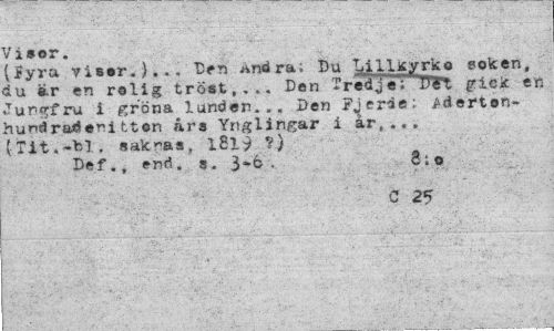 //// Visor. //// (fyra visar.)... Den Andra; Du l^illjcyrko Poken, du är en rolig trö*.t,..'. Den Tred j eT TTtl fick en Jungfru i gröna lunden... Den Fjerie; ^derten-hundradenitten ars Ynglingar i år,... (Tit.-"bl. saknas, l£l9 ?) //// Def., entf. 3. 1-b . 3; o //// C 25 ////