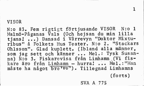 //// 1 //// VISOR //// N:o 83. Fem rigtigt förtjusande VISOR N:o 1 Malmö-^Påganas Vals (Och hejsan du min lilla tjansJ ...) Dansad i Vårrevyn "Doktor Mixtu-ribus" å Folkets Hus Teater. N:o 2. "Stackars Ohlsson". Glad kuplett. (Ibland alla männer, som jag sett och känner ... Mel.: Tysk Susanna) N:o 3. Fiskarevisa från Limhamn,(Vi fiskare äro från Limhamn - hurra.' ... Mel.: "Man måste ha något bre've"). Tillegnad Limhamns //// (forts) //// SVA A 775 ////