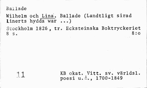 //// Bailade //// Wilhelm och Lina. Bailade (Landtligt sirad linerts hydda war ...) //// Stockholm 1826 , tr. Ecksteinska Boktryckeriet 8 s. 8:0 //// 1 1 KB okat. Vitt. sv. världsl. //// x poesi u.å., 1700-1849 ////