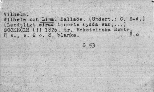 //// Vilhelm. //// 'Jfilhelm och Lina. Eallade. (Undert.: C. S-d.) (Landtligt sirad Lir.erts hydda war;...) SOCKHCLM (J) 1826, tr. Eckateinska Eoktr. 8 s., s.20.8 blanka. 8:o //// G 53 ////