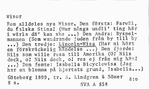 //// Wisor //// Fem alldeles nya Wisor. Den första: Farwäl, du falska Stinai (Hur många undli' ting här i wärla dä' kan ske ...) Den Andra: Byspel-mannen (Som wandrande juden från by till by ...) Den tredje: Lincoln=Wisa (Har ni hört en förskräckelig händelse ...) Den fierde: Nils som wille resa till Amerika (OJ Nils dock, o.' Nils dock, ol res ej från mig hän I ...) Den femte: Isabella Bicyclei^isa (Jag har en blomma på hjertats grund, Isabella...) //// Göteborg 1899, tr. A. Lindgren & Söner g.o //// 8 s" SVA A 858 ////