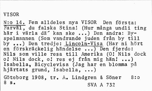 //// VISOR //// N:o 14. Fem alldeles nya VISOR Den första: Farväl, du falska Stina! (Hur många undli ting här i värla dä' kan ske ...) Den andra: By-spelmannen (Som vandrande juden från by till by Den tredje: Lincoln-Visa (Har ni hört //// en förskräckelig händelse ...) Den fjerde: Nils som ville resa till Amerika (OJ Nils dock oj Nils dock, oj res ej från mig hänJ ,..) Isabella, Bicyclevisa (Jag har en blomma på hjärtats grund, Isabella, „.„) //// Göteborg 1908, tr. A. Lindgren & Söner 8:0 //// 8 s* SVA A 732 ////
