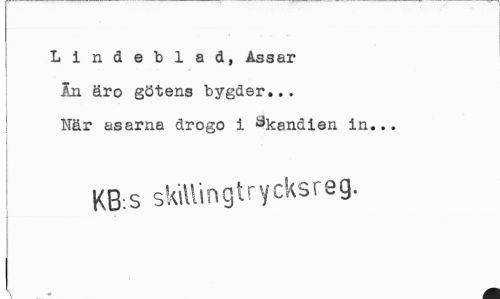 //// Lindeblad, Assar //// An äro götens bygder... //// När asarna drogo i akandien in... //// KB:S skillingtrycksreg. ////