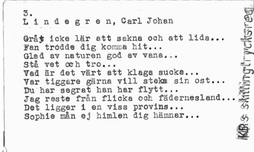 //// 3. p Lindegren, Carl Johan //// Grå$ icke lär att sakna och att lida... 4ä //// Fan trodde dig komma hit... ^J //// Glad av ne turen god av vana... f* //// Stå vet och tro... -fZ //// Vad är det värt att klaga sucka... tr //// Var tiggare gärna vill steks sin ost... .g //// Du har segrat han har flytt... //// Jag reste från flicka och fädernesland... jg //// Det ligger i en viss provins... //// Sophie mån ej himlen dig hämner... ^ //// \ ////