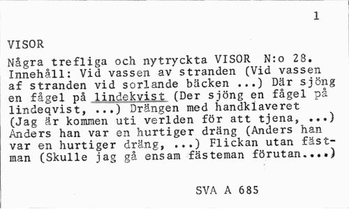 //// 1 //// VISOR //// Några trefliga och nytryckta VISOR N:o 28. Innehåll: Vid vassen av stranden (Vid vassen af stranden vid sorlande bäcken ...) Där sjöng en fågel på lindekvist (Der sjöng en fågel på lindeqvist, ...) Drängen med handklaveret (Jag är kommen uti verlden för att tjena, ...) Anders han var en hurtiger dräng (Anders han var en hurtiger dräng, ...) Flickan utan fästman (Skulle jag gå ensam fäs teman förutan...) //// SVA A 685 ////