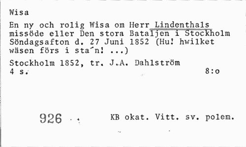 //// Wisa //// En ny och rolig Wisa om Herr Lindenthals missöde eller Den stora Bataljen i Stockholm Söndagsafton d. 2 7 Juni 1852 (Hul hwilket wäsen förs i sta"nl ...) //// Stockholm 1352, tr. J.A. Dahlström 4 s. 8 : o //// 926 • " KB okat- Vitt. sv. polem. ////