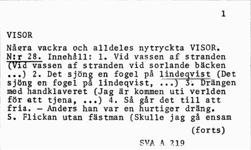 //// 1 //// VISOR //// Några vackra och alldeles nytryckta VISOR. Ni r 28. Innehåll: 1. Vid vassen af stranden (Vid vassen af stranden vid sorlande bäcken .«.) 2. Det sjöng en fogel på lindeqvist (Det sjöng en fogel på lindeqvist, ...) ""37* Drängen med handklaveret (Jag är kommen uti verlden för att tjena, ...) 4. Så går det till att fria. - Anders han var en hurtiger dräng. 5. Flickan utan fästman (Skulle jag gå ensam //// (forts) //// SVA A 719 ////