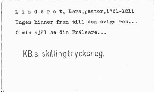 //// Linderot, Lars»pastor,1761-1811 Ingen hinner fram till den eviga ron... 0 min själ se din Frälsare... //// KB:S skillingtrycksreg. //// i ////