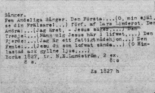 //// Sånger. //// Fem Andeliga Sånger. "Den Företa; ... (O, min själ se din Fräisarel...) förf. af Lars Linderot. De Andra; ...(Jag aret, - Jesu» sä£f¥ f '»I fT Tredje J .. . {Jäfcrrin nig Jesus här i lifwet,...) Den Fjerde;. . .(Jag ar ett fattigt nådehj on...) Den Femte;...(Jesu du som loftrat sända...) (O Htm-lastad ack gyllne ljut,...) Borås 1827, tr. N.lä. Lundström, 2 ex. 8a. 8;o //// Zz 1827 h ////