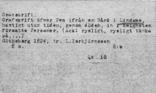 //// Gravskrift. //// Grafskrift öfwer Fem ifrån en Gård i Lindomc, hastigt utur tiden, genom döden, ir f*WféPfften försatte Personer. (Acki rysligt, rysligt tänka på,...) //// GÖtheborg 1824, tr. L.lorbjörnsson //// 8 s. 8; o //// <vC 10 ////