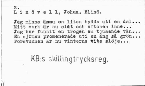 //// 2. //// Lindvall, Johan. Blind. //// Jag minns ämmu en liten hydäa uti en dal... Mitt verk är nu slikt och aftonen inne... Jag har funnit en trogen en tjusande vän... En sjöman promenerade uti en äng så grön... Försvunnen är nu vinterns Vita slöja... //// KB:s skillingtrycksreg. //// ¦ i ////