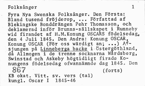 //// Folksånger 1 //// Fyra Nya Swenska Folksånger. Den Första: Bland tusend fröjderop, ... Författad af Blekingske Bonddrängen Pehr Thomasson, och deklamerad inför Brunns-sällskapet i Runneby wid firandet af H.M.Konung OSCARS födelsedag, den 4 Juli 1845. Den Andra: Konung OSCAR, Konung OSCAR (För oss wärdigt an; ...) Af-sjungen på Linneberga backe i östergöthland, da Allmogen i de trenne socknarna Wårdsberg, Swinstad och Askeby högtidligt firade Konungens födelsedag ofwannämnde dag 1845„ Den //// 867 (forts) //// KB okat. Vitt. sv. vers (tal) kungl. Oscar I 1845-46 ////