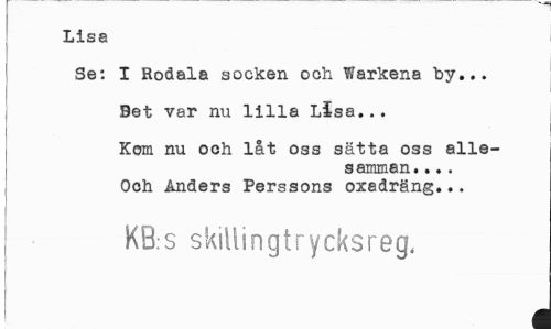 //// Lisa //// Se: I Rodala socken ooh Warkena by... //// Bet var nu lilla Lisa... //// Kom nu och låt oss sätta oss allesamman. .. . Och Anders Perssons oxadräng... //// KB:S skillingtrycksreg, //// ä ////