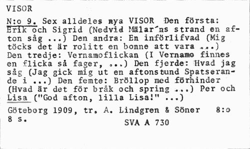 //// VISOR //// N:o 9. Sex alldeles nya VISOR Den första: Erik och Sigrid (Nedvid Mälarens strand en afton såg ...) Den andra: En införlifvad (Mig töcks det är rolitt en bonne att vara .,..) Den tredje: Vernamoflickan (I Vernamo finnes en flicka så fager, Den fjerde: Hvad jag //// såg (Jag gick mig ut en aftonstund Spatseran-de i ...) Den femte: Bröllop med förhinder (Hvad är det för bråk och spring ...) Per och Lisa ("God afton, lilla Lisa!" ...) //// Göteborg 1909, tr. A. Lindgren & Söner 8:0 //// 8 s* SVA A 730 ////