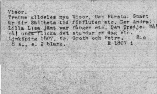 //// Visor. //// Tre~ne alldeles nya Wisor, Den Första; Snart //// ar dir Sällhets tid förfluten ste. Der Andra: //// war fingen »tc\ Sen ?r«dj®; //// nA! ut^S-Tlicica det stundar en dag e'tn,; ' //// winköpire 1807, tr. Oroth och Pst re. 8; o //// 8 s., s. 2 blank. I 180? i //// ' • : //// [ • ' 1 ' -f -w ', --t'"\ .,,. :'xs,:...y\ ¦ ¦ ¦ ¦ ////
