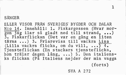 //// 1 //// SÅNGER //// ELLER VISOR FRÄN SVERIGES' BYGDER OCH DALAR N:o 14. Innehåll: 1. Fiskargossen (Hvar mor-gon jag ilar så gladt ned till strand, ...) 3. Fiskarflickan (Det var en gång en liten tärna ...) 3. Friarevisa till vackra Lisa (Lilla vackra flicka, om du vill, ...) 4. Tjensteflickan (En stackars tjensteflicka, hon trälar dagen lång, ...) 5. Den italienska flickan (På Italiens nejder der min vagga //// (forts) //// SVA A 2 72 ////