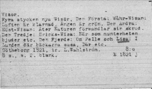 //// Visor. //// Fyra stycken nya Wisör, Den Första; Wahr»WJsan; Lufter är klarnad. Ängen är gren. Der Ardra; Kust-Wjsan: Äter Naturen förvandlar sir skrud . Den Tredje; Dricks~Wisa: När 30m munterheten bjuder etc. Den Fjerde; Om Pelle och Lisa; I //// Lunden där bäckarna susa, D«ir etc._^___ //// löthetcrr 1321, tr. L.¥ahlstrom. 3:o //// 8 3., s. 2. blank. & 1821 j ////