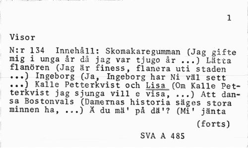 //// 1 //// Visor //// N:r 134 Innehåll: Skomakaregumman (Jag gifte mig i unga år då jag var tjugo år ...) Lätta flanören (Jag är finess, flanera uti staden ...) Ingeborg (Ja, Ingeborg har Ni väl sett ...) Kalle Petterkvist och Lisa (Om Kalle Petterkvist jag sjunga vill e visa, ...) Att dansa Bostonvals (Damernas historia säges stora minnen ha, .».) Ä du mä' på dä1? (Mi* jänta //// (forts) //// SVA A 485 ////
