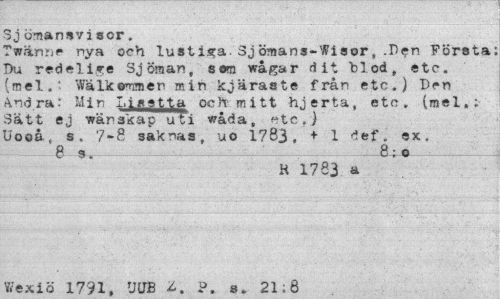 //// 3jömansvisor. //// Twänii^ nya och lustiga-3j ömans-Wiaor, .Den Första; Du redelige Sjöman, sern wågar dit blod, etc. (mel.* Wälkemmen min k järas te från etc.) Den Andra: Min Lias^ta och mitt hjerta, etc. (mel.; Sätt ej vänskap uti wåda, ^tc ,) Uooå, s. 7-8 saknas, uo 1783, + 1 def. ex, //// -... 8 9. 8; O //// H 1783 a Wexiö 1791. UUB z. P. 21;8 ////
