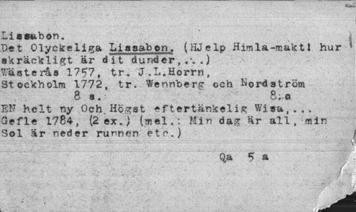 //// Liesabon. //// Det Olyckeliga Lissabon. (HJelp Himla-makti hur 1 //// skräckligt är dit dunder,.;,) //// Västerås 175?, tr. J.L.Horrn, //// Stockholm 1772, tr. Wennberg och ^ordström //// 8 a. 8;o //// EN helt ny Och Högst eftertänkelig Wisa,... 3efle 1784, (2 ex.) (mel.: Min dag är all, min Sol är neder runnen etc.) //// Q,a 5 a ////