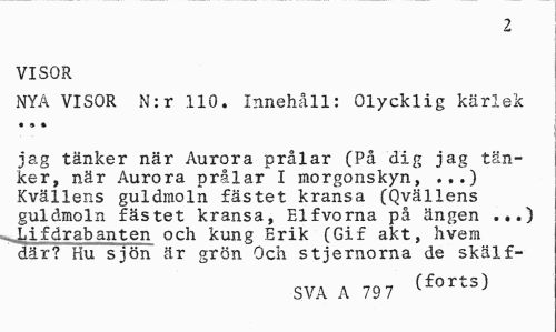 //// 2 //// VISOR //// NYA VISOR N:r 110. Innehåll: Olycklig kärlek //// • 9 » //// jag tänker när Aurora prålar (På dig jag tänker, när Aurora prålar I morgonskyn, .,.) Kvällens guldmoln fästet kransa (Qvällens guldmoln fästet kransa, Elfvorna på ängen ...) . Lifdrabanten och kung Erik (Gif akt, hvem där? Hu sjön är grön Och stjernorna de skälf- //// SVA A 79 7 (forts) ////
