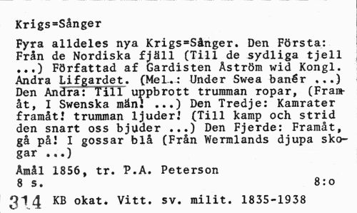 //// Krigs=Sånger //// Fyra alldeles nya Krigs-Sånger. Den Första: Från de Nordiska fjäll (Till de sydliga tjell Författad af Gardisten Äström wid Kongl. Andra Lifgardet. (Mel.: Under Swea banér ...) Den Andra: Till uppbrott trumman ropar, (Framåt, I Swenska mänS ...) Den Tredje: Kamrater framåt! trumman ljuder.' (Till kamp och strid den snart oss bjuder ...) Den Fjerde: Framåt, gå pål I gossar blå (Från Wermlands djupa skogar ...) //// Åmål 1856, tr. P.A. Peterson 8 s. 8:0 //// KB okat. Vitt. sv. milit. 1835-1938 ////