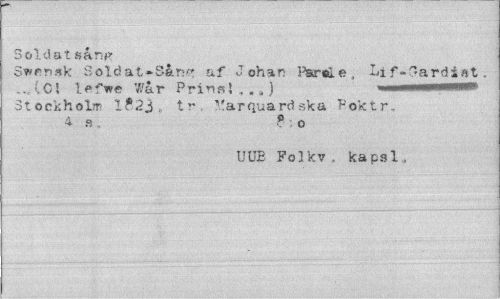 //// Soldat fäån*> //// Sv msk Soldat-Såm* af Johan tfar«Le , £>if-?ardi»t. //// .Cl lefwe War Prinal,,4) Stockholm l?2i tr. 3'arquard ska Poktr. 4 b , ? o //// UUE Polkv, kapsl, ////