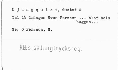 //// Ljungquist, Gustaf G //// Tal då drängen Sven Persson ... blef hals //// huggen... //// Se: 0 Persson, S. //// KB:S skillingirycksreg. ////