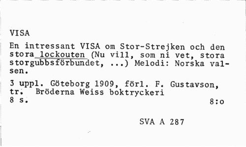 //// VISA //// En intressant VISA om Stor-Strejken och den stora lockouten (Nu vill, som ni vet, stora storgubbsförbundet, ...) Melodi: Norska valsen. //// 3 uppl. Göteborg 1909, förl. F. Gustavson, tr. Bröderna Weiss boktryckeri 8 s. 8:o //// SVA A 28 7 ////