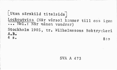 //// i_Utan särskild titelsida] //// Lockoutvisji (När vårsol kommer till oss igen ... Mel.: När månen vandrar) //// Stockholm 1905, tr. Wilhelmssons Boktryckeri A. B. //// 4 s. 8:0 //// SVA A 473 //// i ////