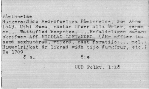 //// <Hun inneise //// Hungers-Nödz Bedröfweliga Påminnels*,. 3or. Ar»no 1649- Uthi Swea, nästar öfwer alla ''Hrter, »rensm ert»,, Wattufled fce-Tyntes „ . . .Enfald *1 i.f?en aa/San-skrifwer. Aff FICOLAO LOFTANpRG. (ÅHr effter tu-se nd sexhundralH^TflT^W^nS!^ fyratij o: . . . mel, . Hir.melrijket är liknad widh tij o (Jungfrur, etc.) Ue 1709 //// ? 3, ?1» //// UUB Folk v. 1.3.8 ////
